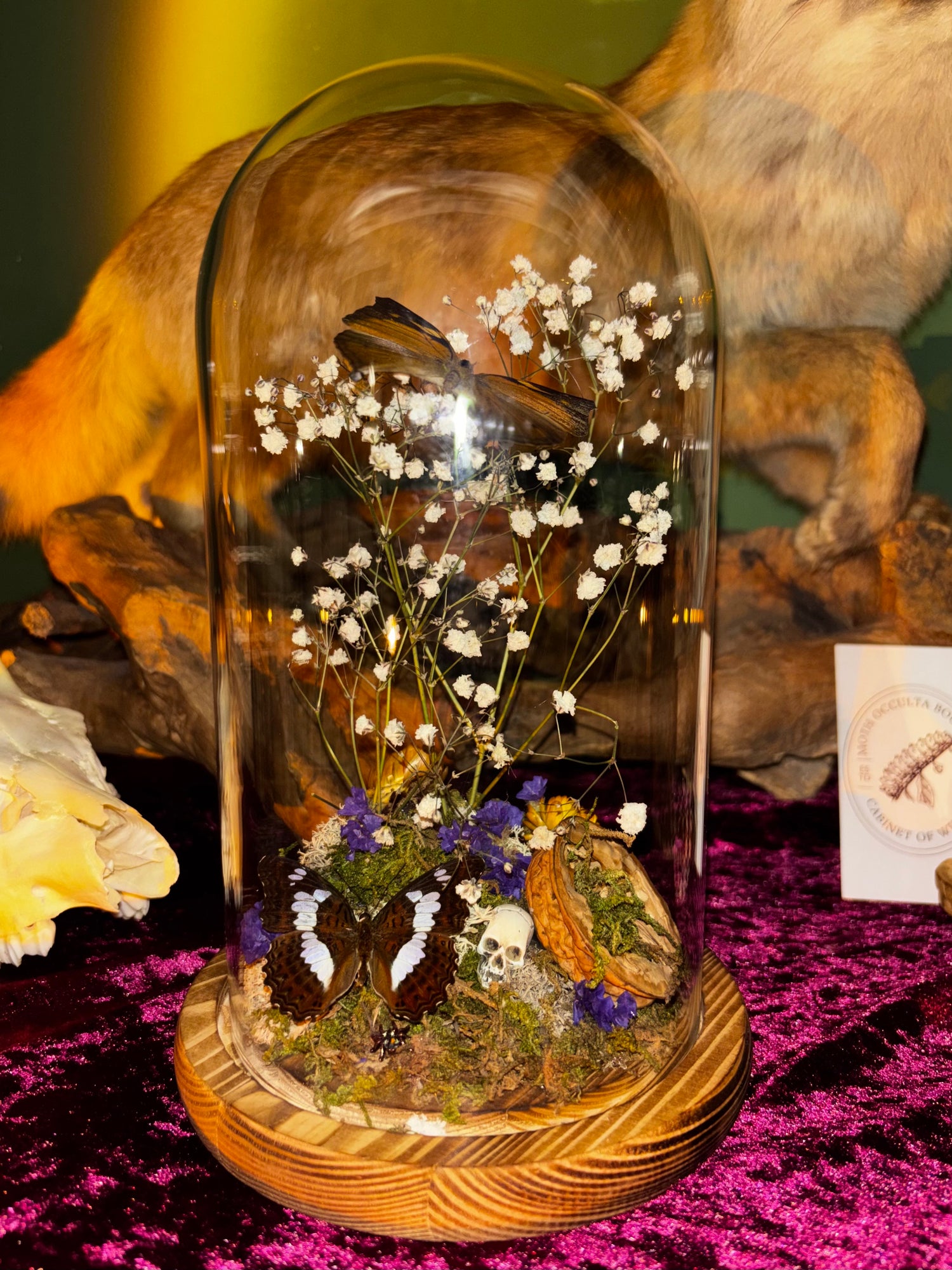 Schmetterlings-Diorama unter Glasglocke mit echten Trockenblumen