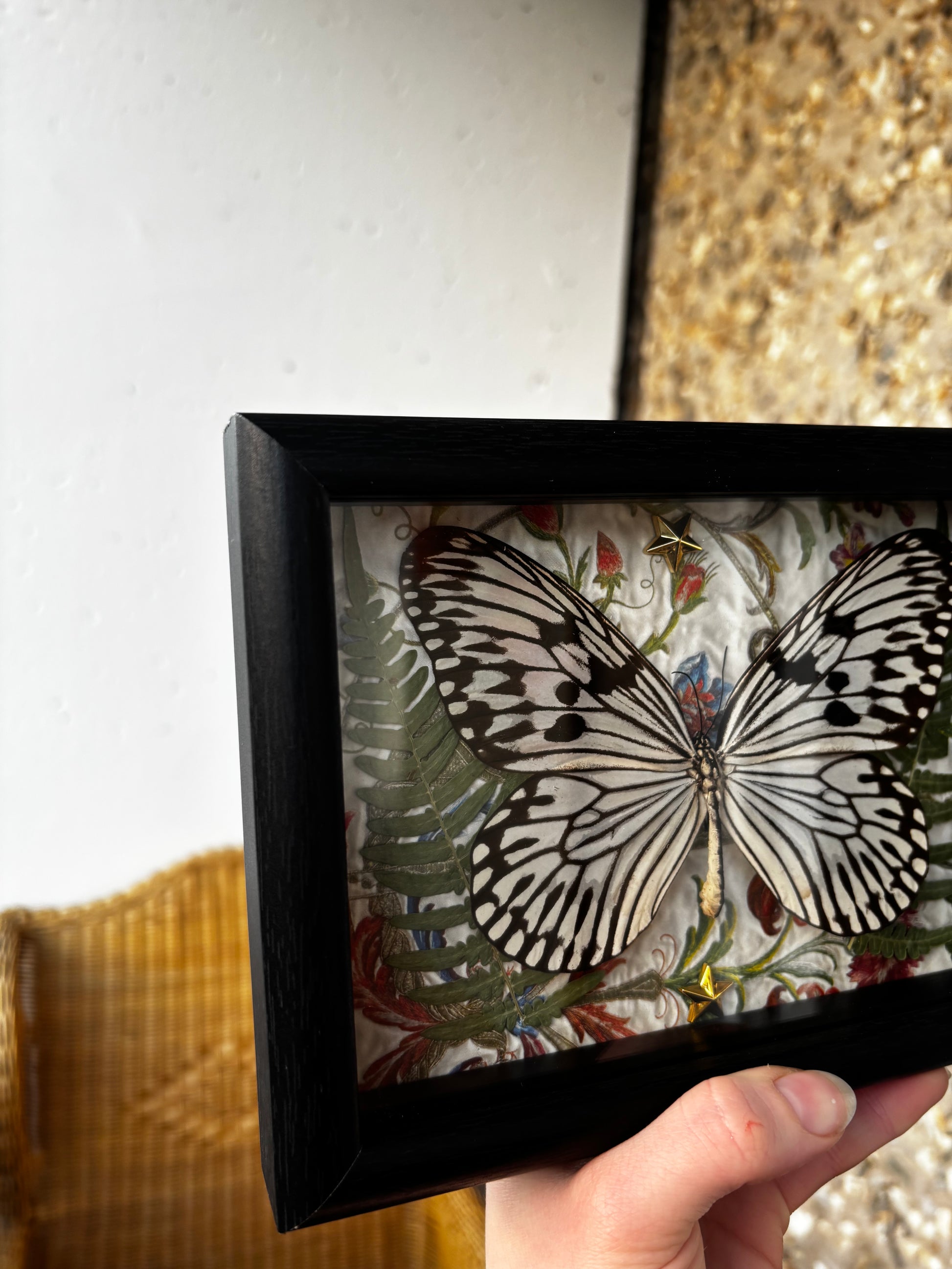 A captivating work of art from nature for your home: This impressive butterfly is stylishly presented and artfully showcased in a high-quality black frame. The delicate wings in shades of white and black create a beautiful contrast to the detailed floral background.