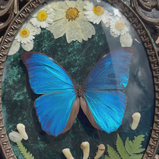Matériaux : Papillon « Morpho didius » véritable, fleurs séchées, feuilles de fougère, dents d'animaux, velours, cadre en métal