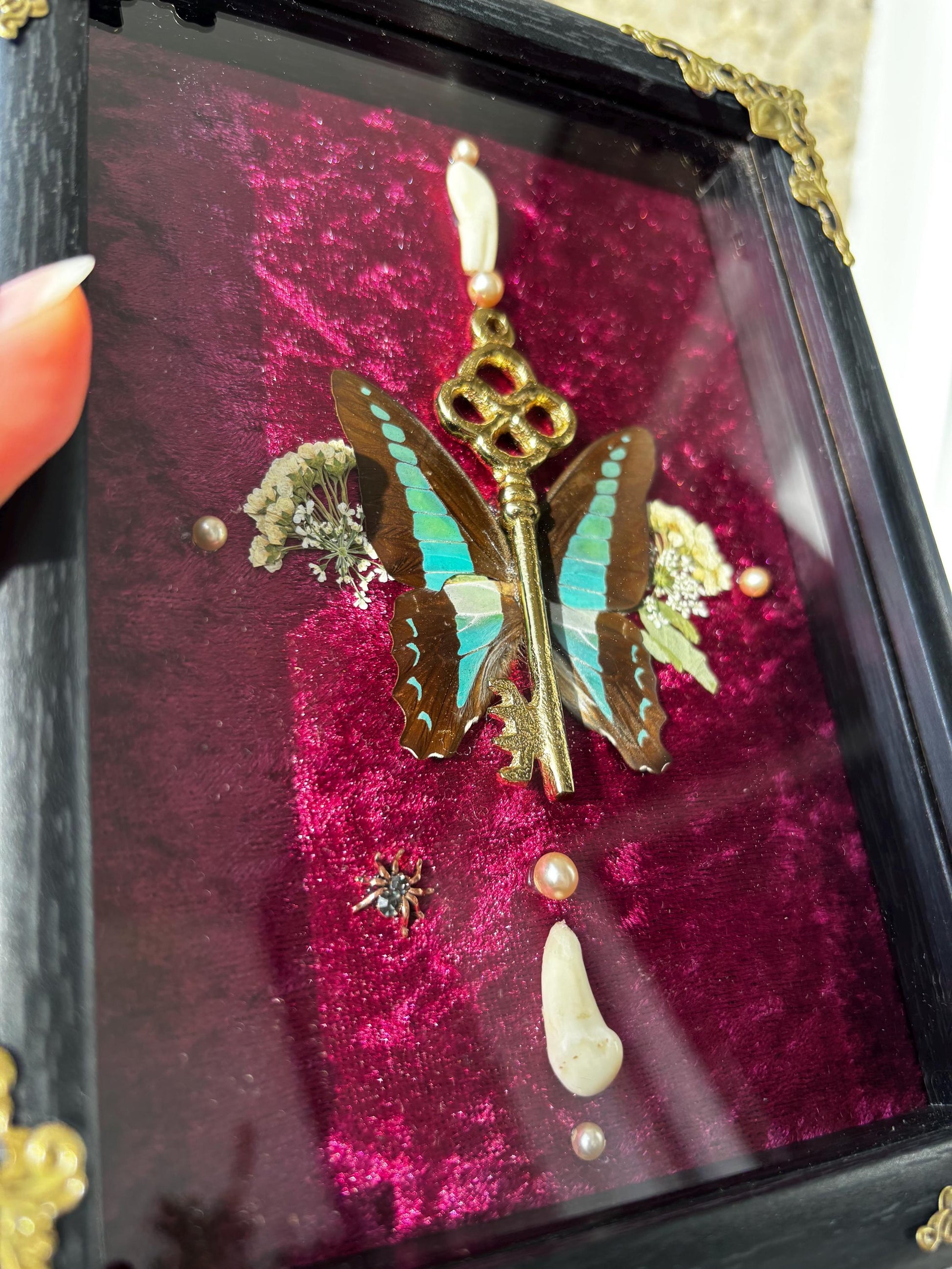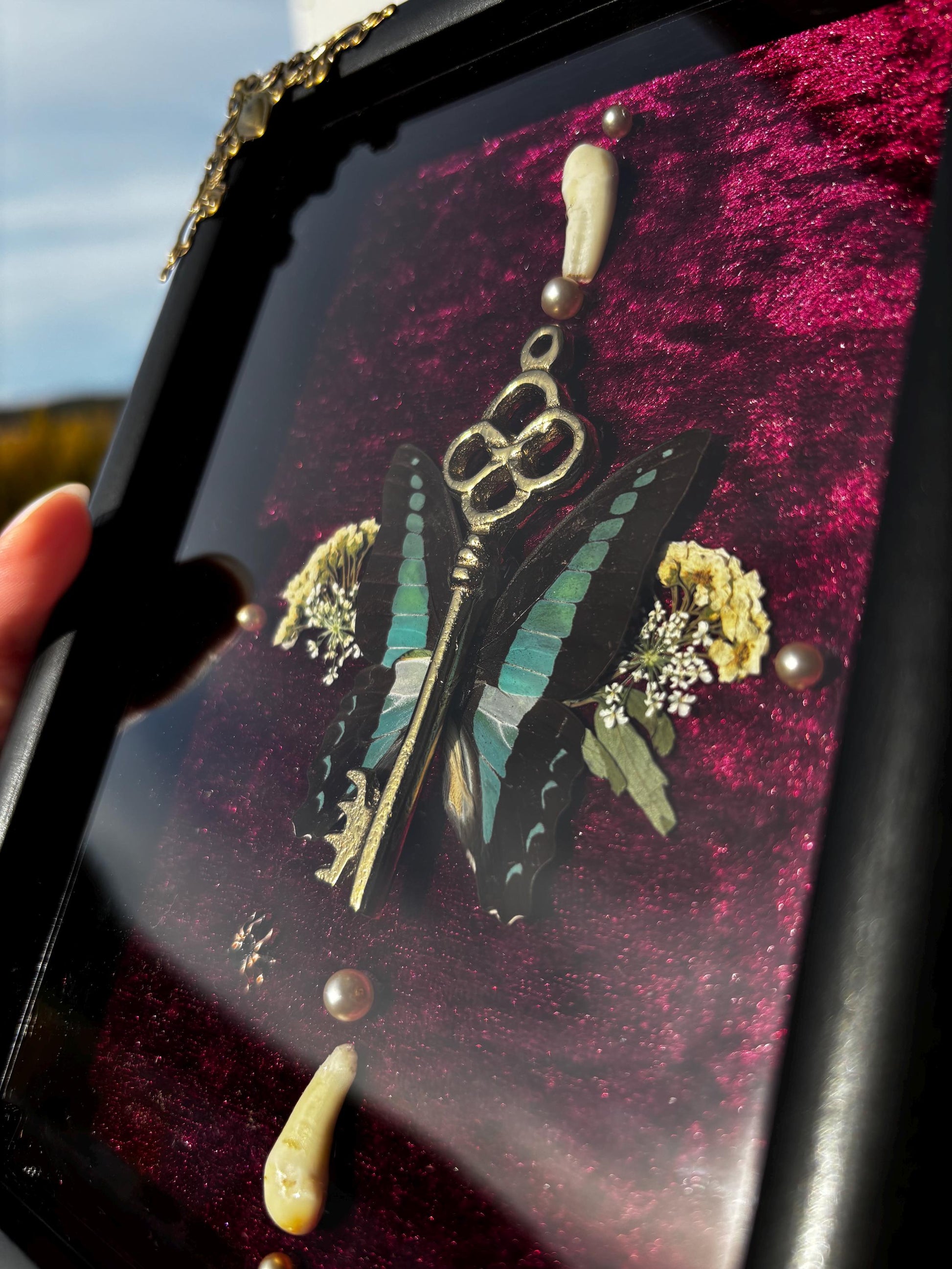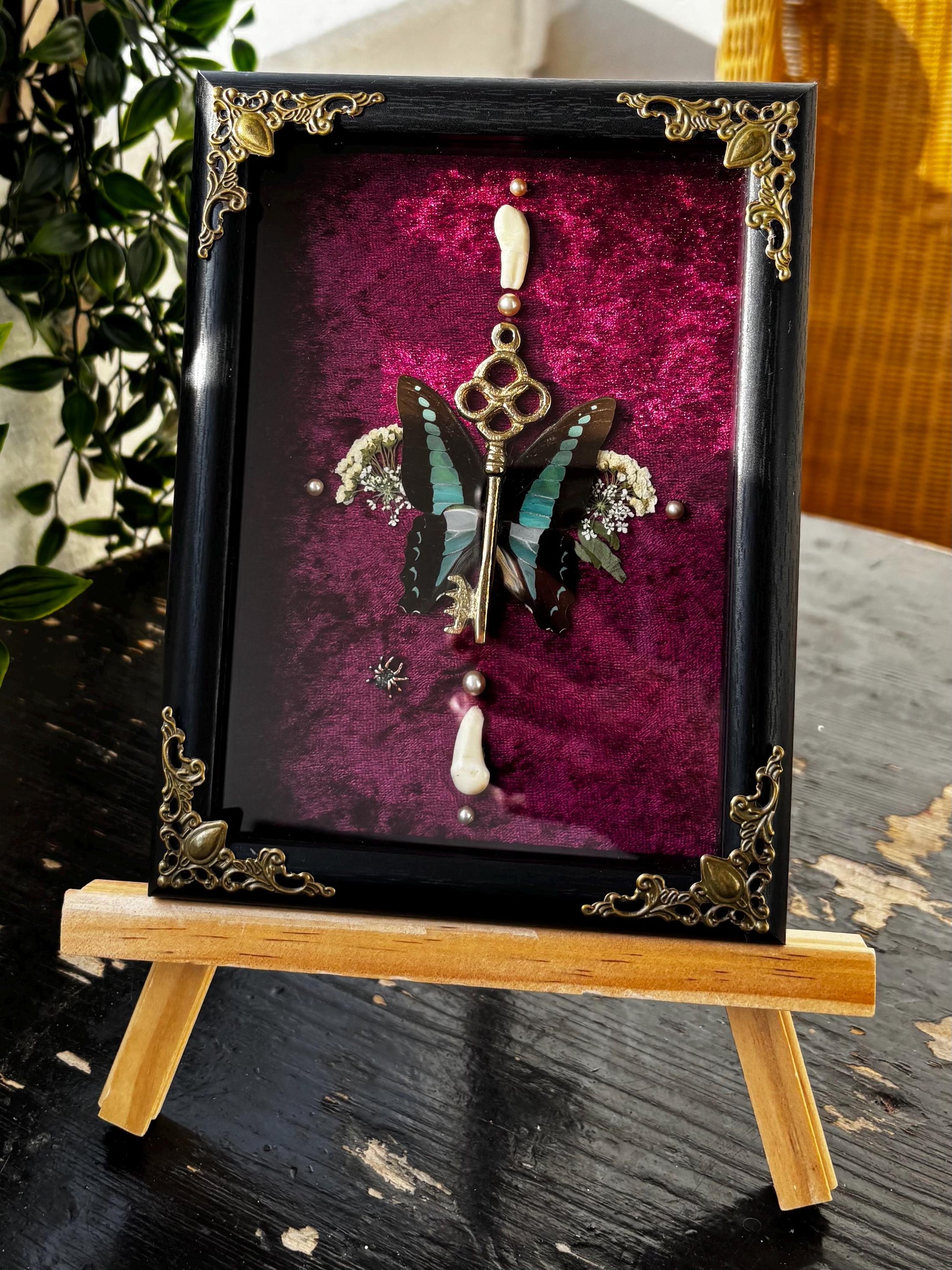 Eingebettet in einen edlem, dunkelrotem Samt-Hintergrund, wird der Schmetterling von kleinen, getrockneten Blumen, Perlen und zwei kleinen Tierzähnen umgeben. Diese Kombination schafft eine faszinierende Verbindung zwischen Schönheit und Vergänglichkeit.