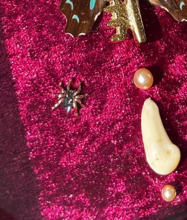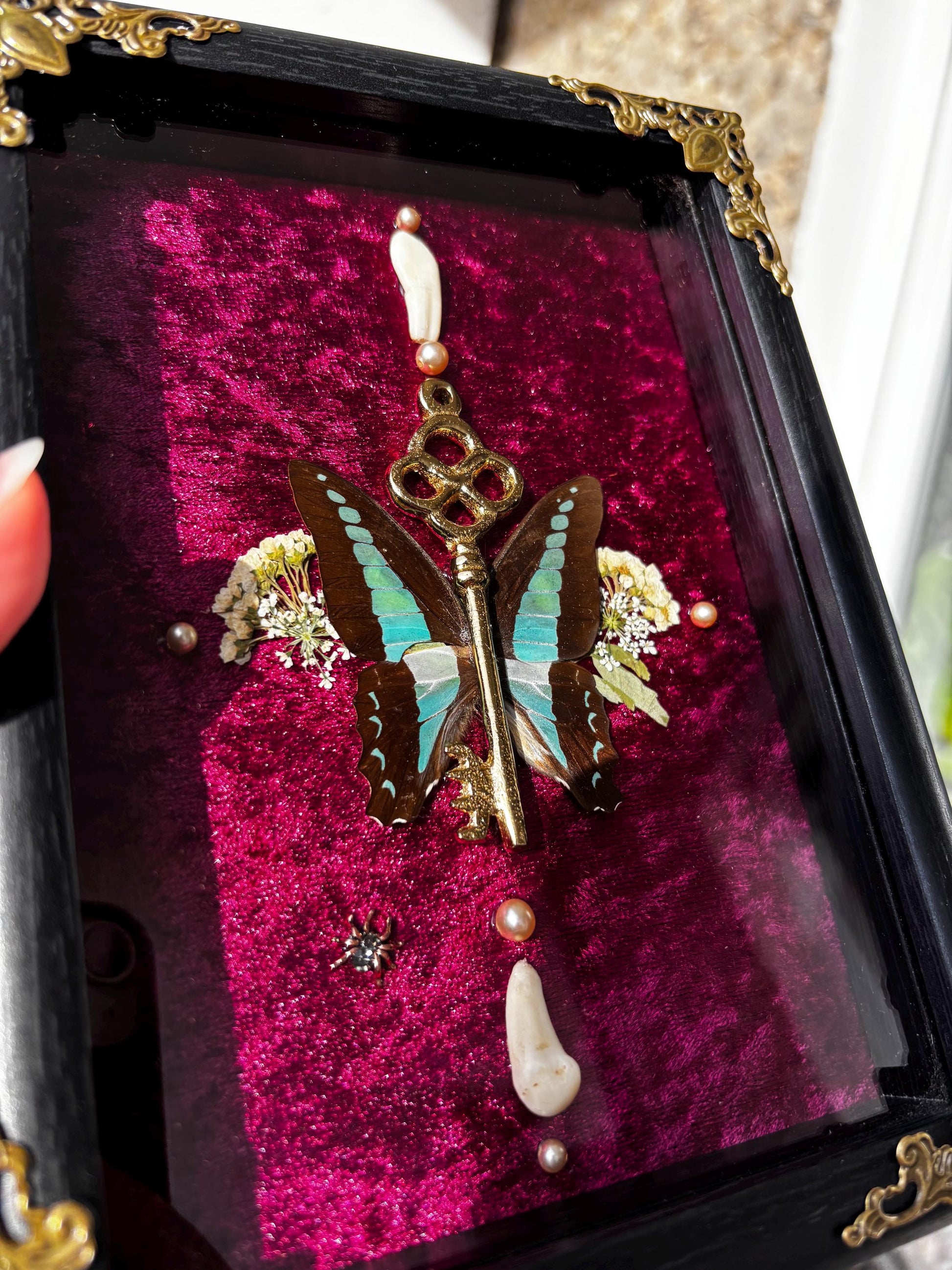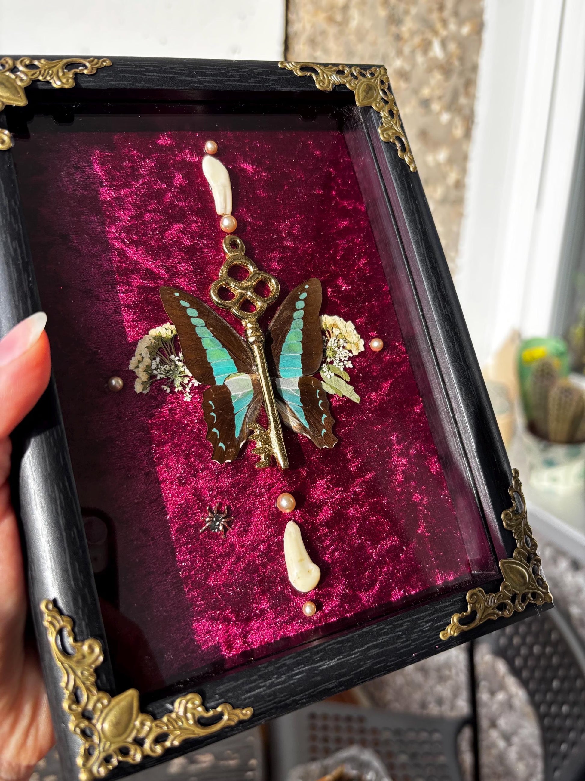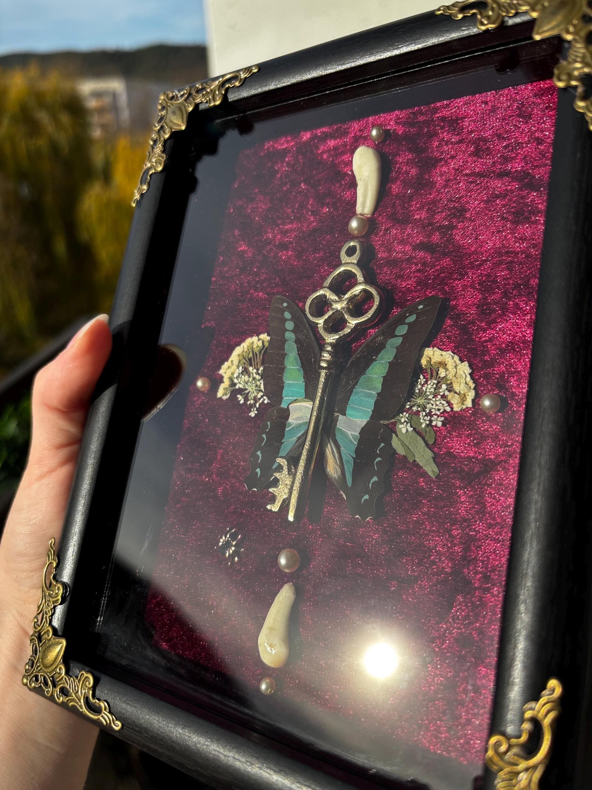 Eingebettet in einen edlem, dunkelrotem Samt-Hintergrund, wird der Schmetterling von kleinen, getrockneten Blumen, Perlen und zwei kleinen Tierzähnen umgeben. Diese Kombination schafft eine faszinierende Verbindung zwischen Schönheit und Vergänglichkeit.