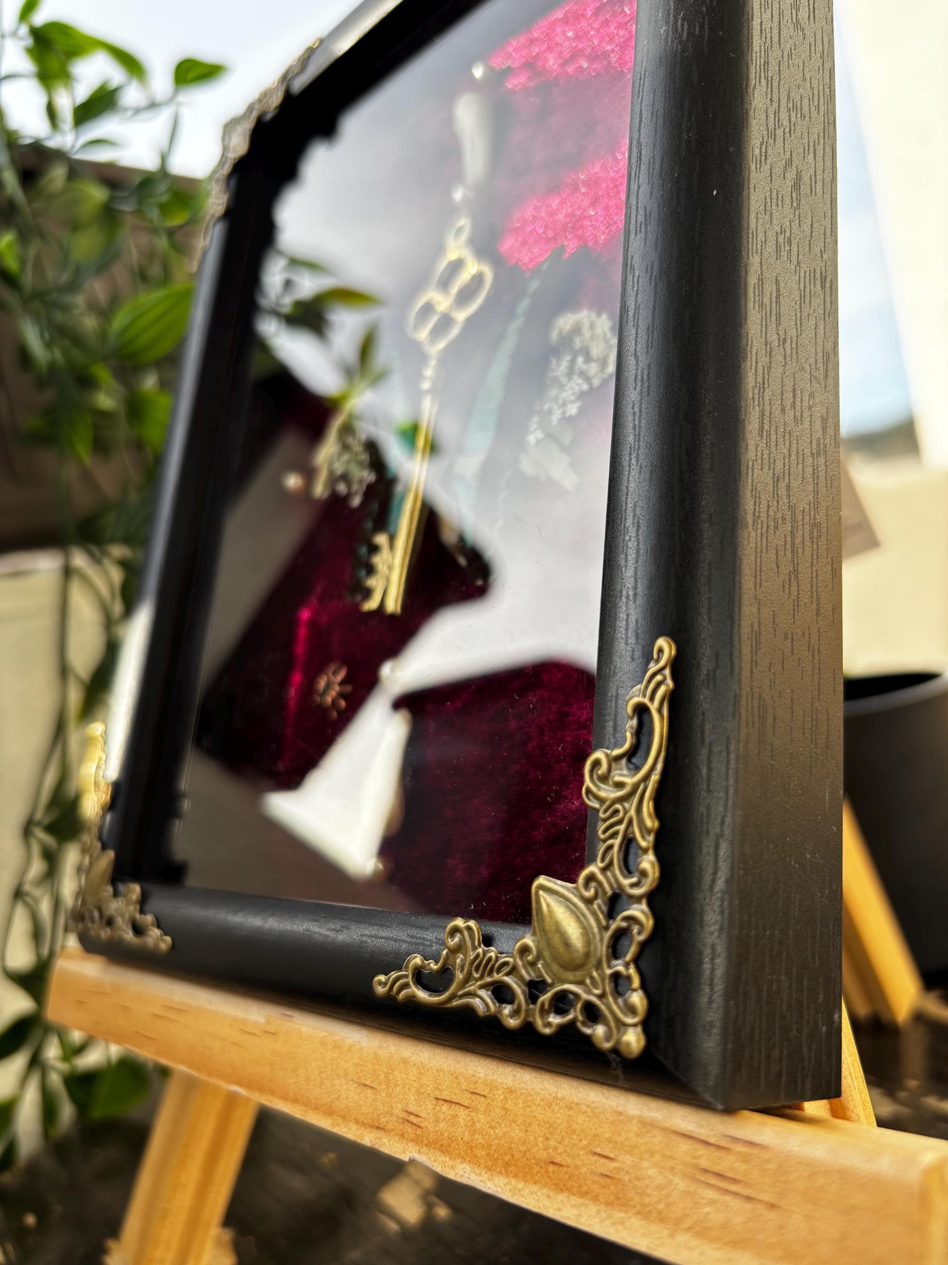 Das gesamte Arrangement ist in einem detailreichen, schwarzem Rahmen im Barock-Stil aus Holz untergebracht. Die aufwendigen Verzierungen und die goldene Patina verleihen dem Stück eine nostalgische und mystische Ausstrahlung. Jeder Rahmen erzählt seine eigene Geschichte und weist kleine, charmante Unregelmäßigkeiten auf, die seinen mysteriösen Charakter unterstreichen.