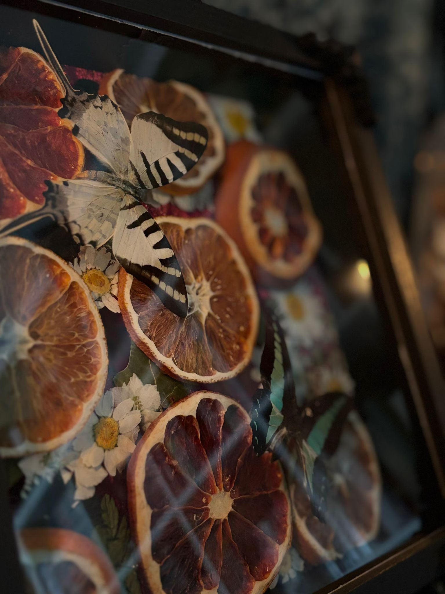 Verwandle deine Wohnräume mit diesem kunstvoll, in Kombination mit getrockneten Orangenscheiben und echten Blüten, gerahmten Kolibrifalter und dem Fünfbalken-Schwertschwanz in ein wahres Kuriositätenkabinett. Der leuchtend türkis-schwarz gefärbte Schmetterling wurde mit viel Liebe zum Detail präpariert und in einem dekorativen 3D-Rahmen in Szene gesetzt. Der aufwendig verzierte schwarze Rahmen mit barocken Eckapplikationen verleiht dem Werk eine elegante, fast viktorianische Ausstrahlung - ideal für Gothic-Deko, Naturfreunde oder Sammler*nnen seltener Insekten.